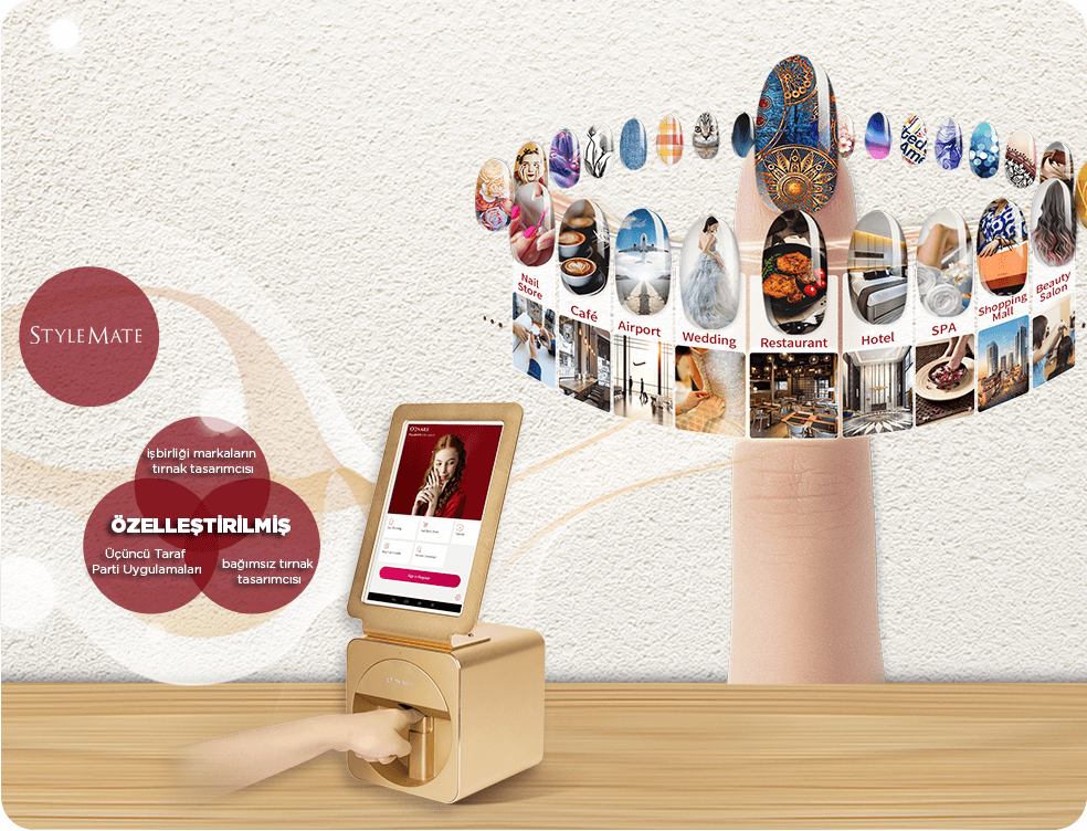 Tırnak üzerinde herhangi bir deseni basabilen küçük bir masaüstü akıllı tırnak cihazı. Ürün, yüksek kaliteli ticari tırnak sanat servisi için uygundur. Entegre cihazın ekranında STYLEMATE UYGULAMASI veya özelleştirilmiş UYGULAMA tarafından kontrol edilir.